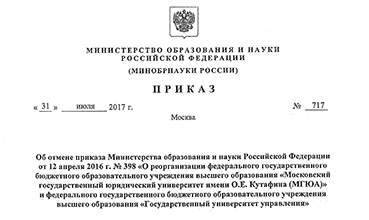 Министр образования и науки России Ольга Васильева подписала Приказ об отмене реорганизации Государственного университета управления...